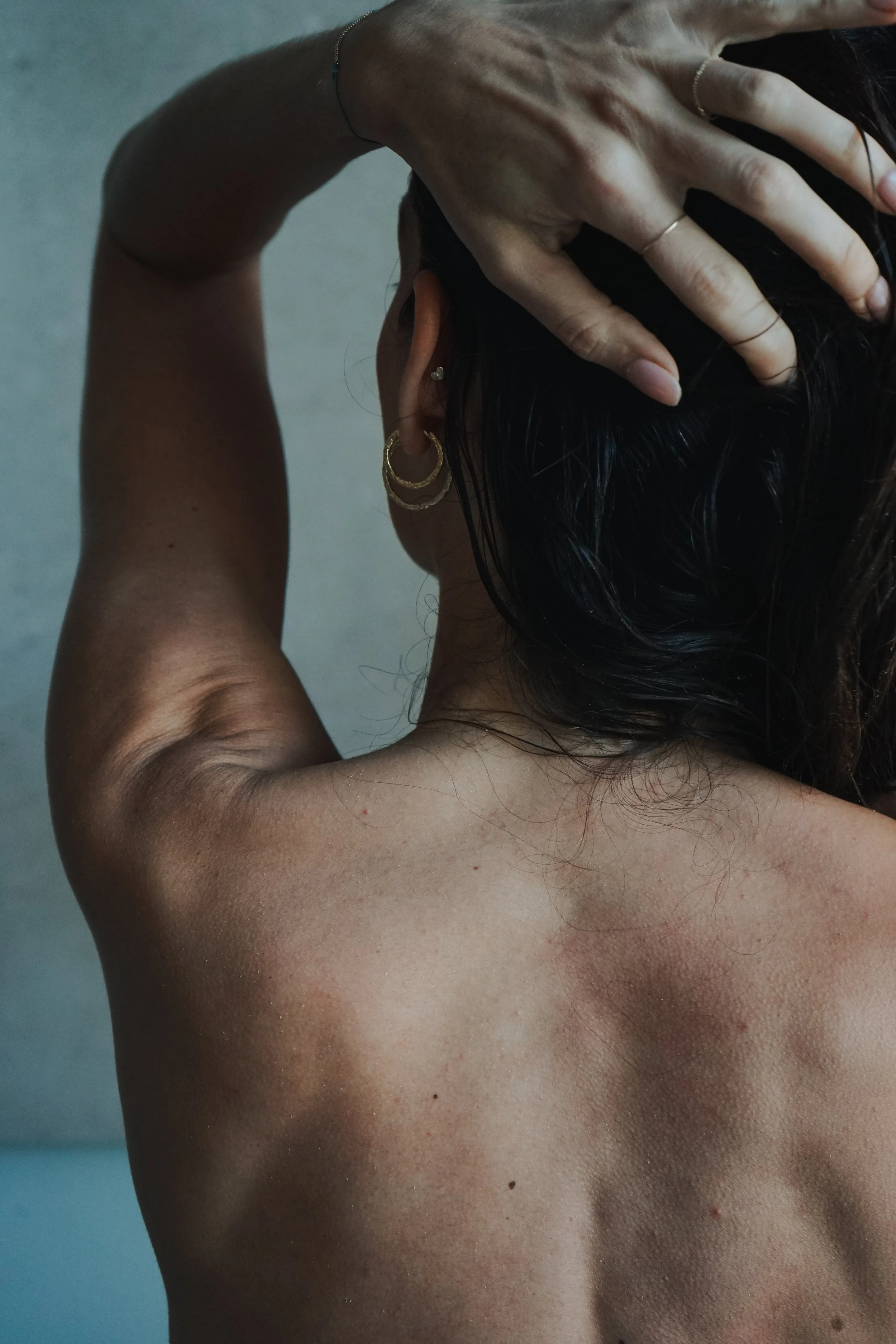 A woman with dark hair is posing with her back to the camera, her left arm bent with her hand on her head, revealing her shoulder and back. She is wearing multiple gold earrings and rings, with a simple black bracelet on her wrist.